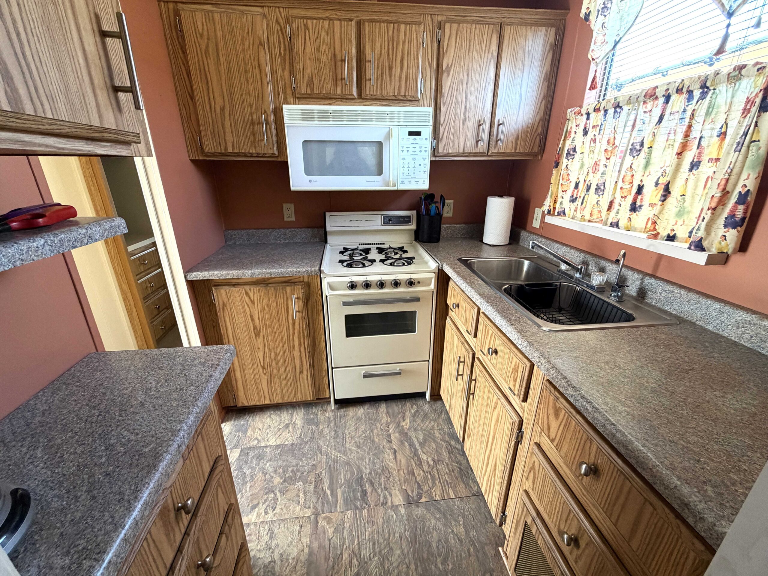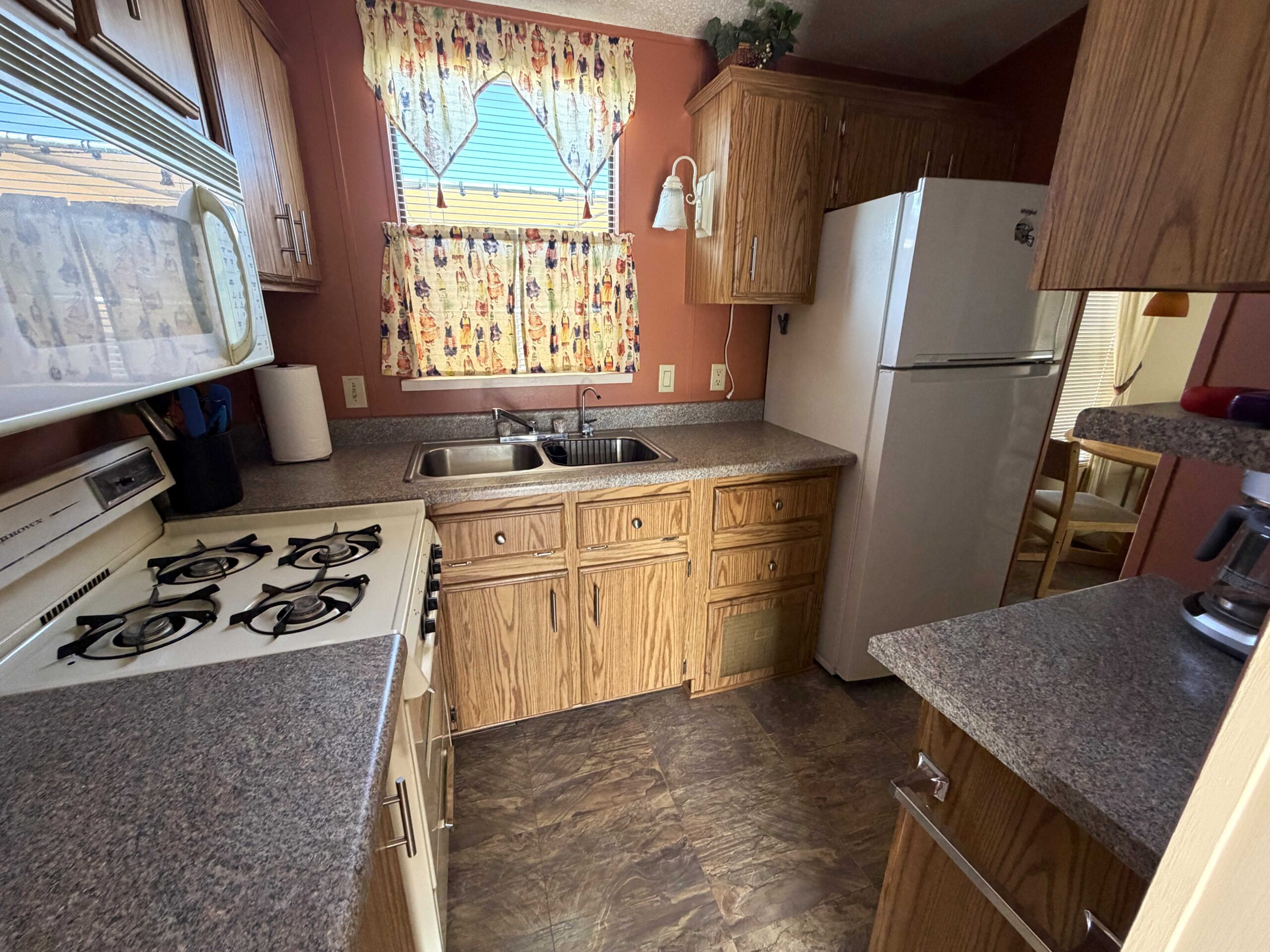 - L shaped kitchen with gas stove, RO system, plenty of storage, and a full size fridge