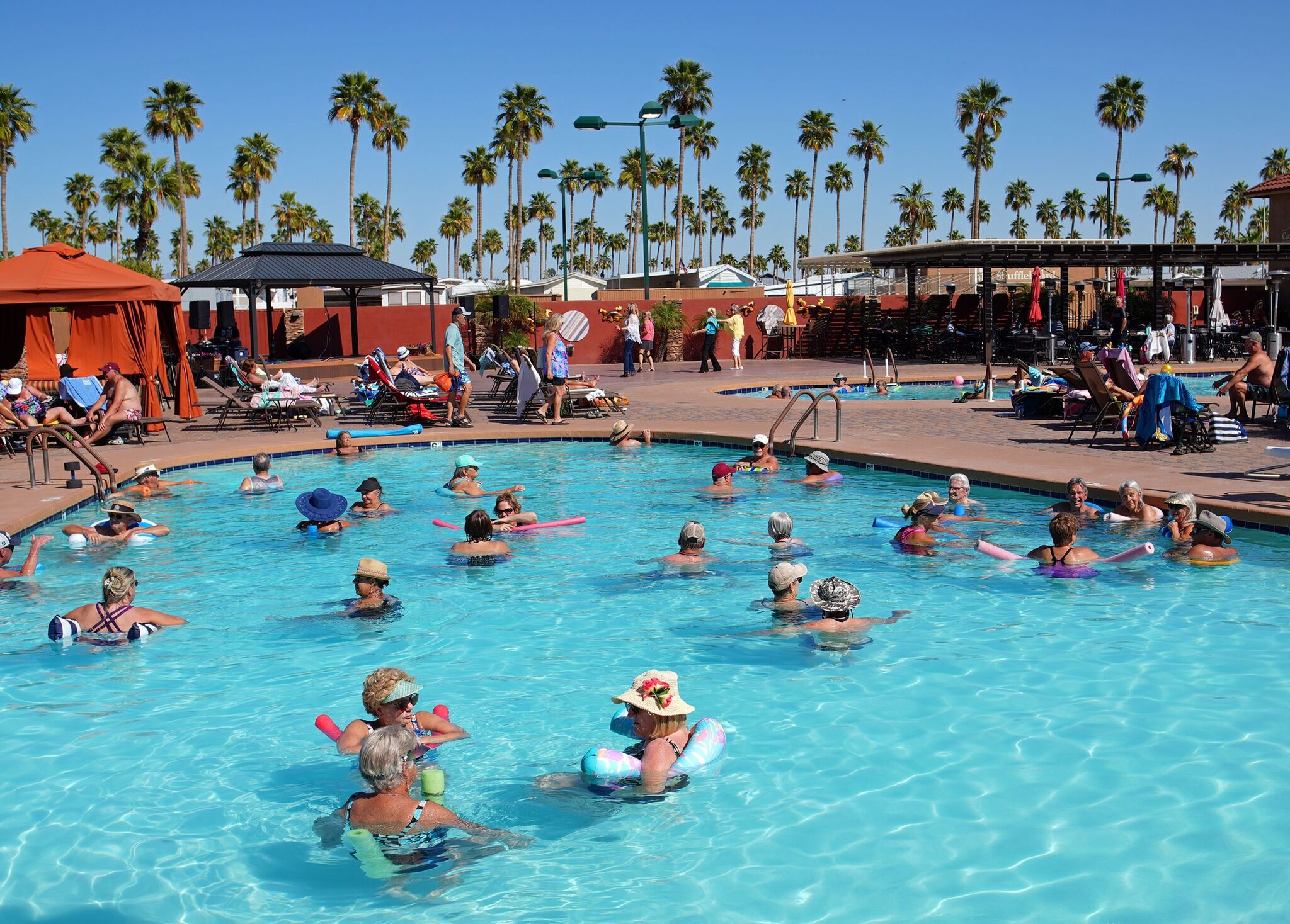 This RV park in Mesa, AZ is fully equipped with plenty of amenities and activities to choose from. In the very center of the Good Life community, you’ll find two sparkling pools and spas, our famous Cactus Grill, and our very own Post Office! For the sports lover, our outdoor areas feature a patio and BBQ, pickleball courts, bocce ball, horseshoes, corn hole, putting green, a batting cage, and a driving range, plus more! You can learn all about our amenities below.